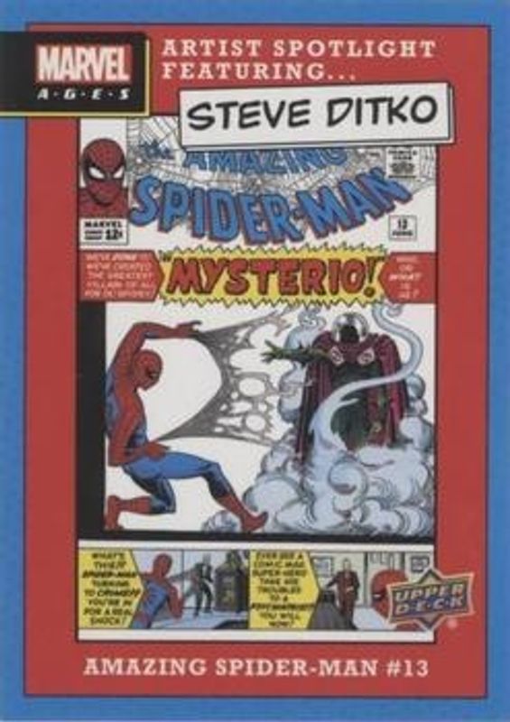 The Spider-Man 2020 Upper Deck Marvel Ages #ASF-4 Artist Spotlight featuring Steve Ditko card is 1 of 26 Spider-Man's card variations in the 2020 Upper Deck Marvel Ages set being tracked by Sports Card Investor, including #282 Base, #282 High Series Foil Board, #3D-3 3 D Lenticular Puzzles, #3D-4 3 D Lenticular Puzzles, and #3D-1 3 D Lenticular Puzzles.