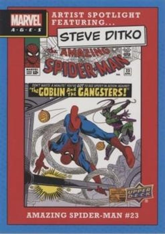 The Spider-Man 2020 Upper Deck Marvel Ages #ASF-5 Artist Spotlight featuring Steve Ditko card is 1 of 26 Spider-Man's card variations in the 2020 Upper Deck Marvel Ages set being tracked by Sports Card Investor, including #282 Base, #282 High Series Foil Board, #3D-3 3 D Lenticular Puzzles, #3D-4 3 D Lenticular Puzzles, and #3D-1 3 D Lenticular Puzzles.