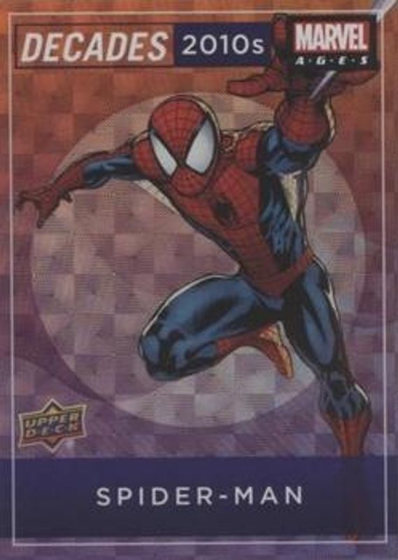 The Spider-Man 2020 Upper Deck Marvel Ages #D11-7 Decades 2010s card is 1 of 26 Spider-Man's card variations in the 2020 Upper Deck Marvel Ages set being tracked by Sports Card Investor, including #282 Base, #282 High Series Foil Board, #3D-3 3 D Lenticular Puzzles, #3D-4 3 D Lenticular Puzzles, and #3D-1 3 D Lenticular Puzzles.