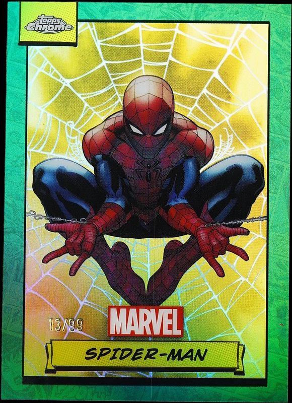 The Spider-Man 2024 Topps Chrome #1 Green Refractor /99 card is 1 of 86 Spider-Man's card variations in the 2024 Topps Chrome set being tracked by Sports Card Investor, including Base, Refractor, Spiderweb Refractor /399, Blue Wave Refractor /150, and Green Gamma Ray Wave Refractor /99.