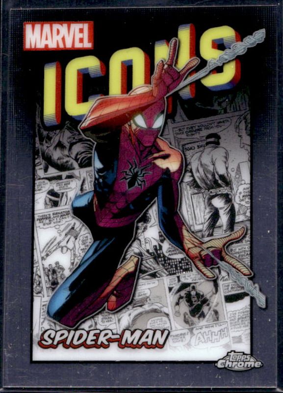 The Spider-Man 2024 Topps Chrome #MI-1 Marvel Icons card is 1 of 86 Spider-Man's card variations in the 2024 Topps Chrome set being tracked by Sports Card Investor, including Base, Refractor, Spiderweb Refractor /399, Blue Wave Refractor /150, and Green Gamma Ray Wave Refractor /99.