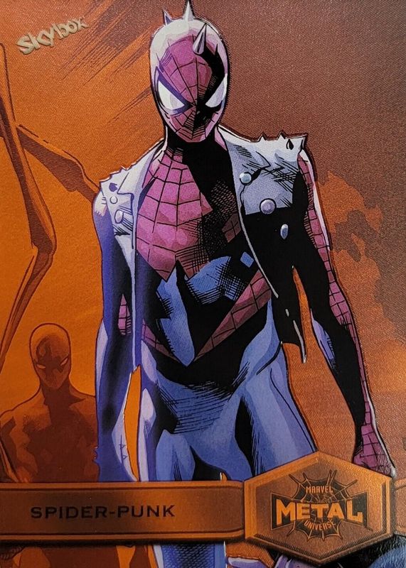 The Spider-Punk 2021 Skybox Marvel Metal Universe Spider-Man #186 Light FX Orange (High Series) /25 card in Raw condition has not changed in price in the last 30 days and was last sold for $118.06 .