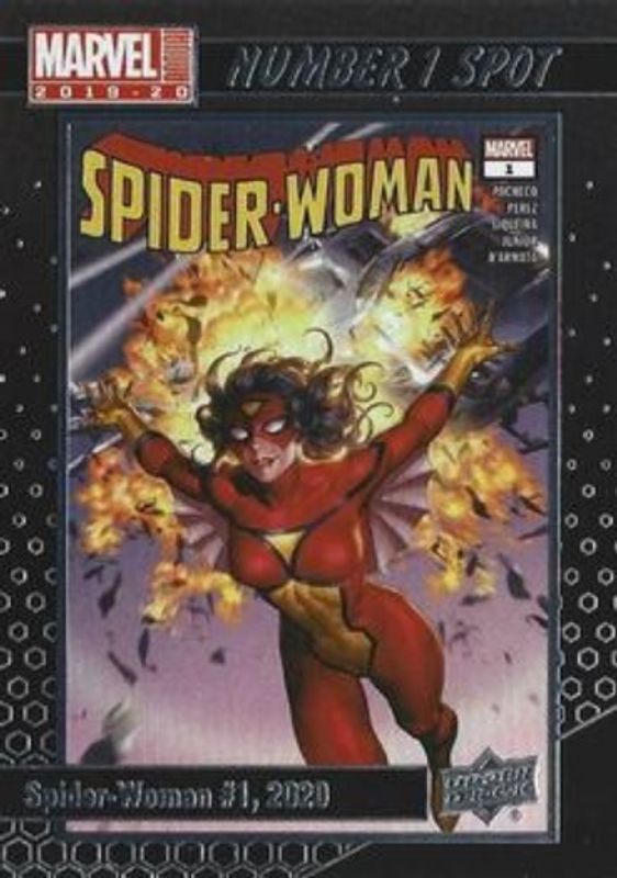 The Spider-Woman 2019 Upper Deck Marvel Annual #N1S-18 Number 1 Spot card is 1 of 14 Spider-Woman's card variations in the 2019 Upper Deck Marvel Annual set being tracked by Sports Card Investor, including Base, Fractal, Pack Wars, Variant Cover, and Hologram /20.