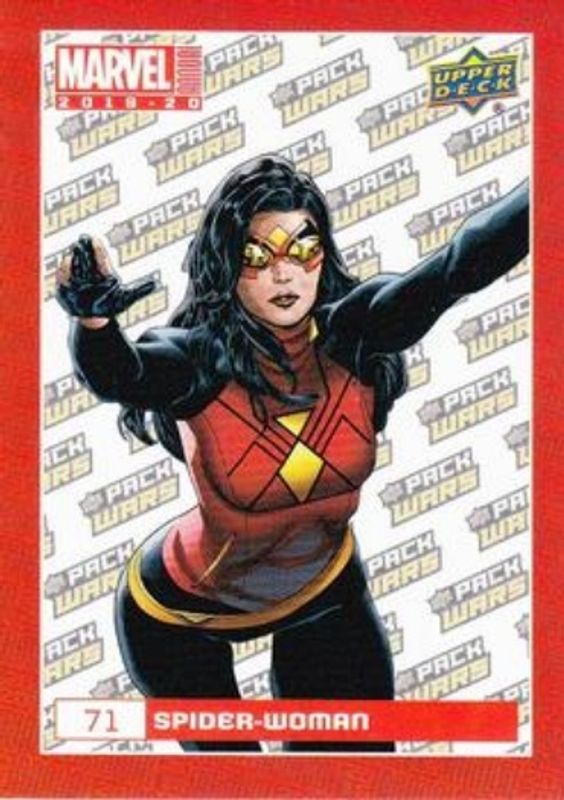 The Spider-Woman 2019 Upper Deck Marvel Annual #71 Pack Wars card is 1 of 14 Spider-Woman's card variations in the 2019 Upper Deck Marvel Annual set being tracked by Sports Card Investor, including Base, Fractal, Variant Cover, Hologram /20, and Printing Plate Cyan /1.