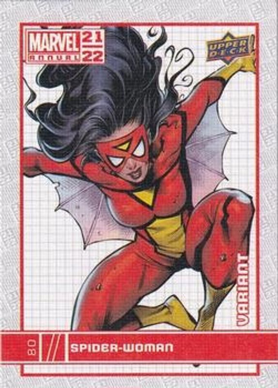The Spider-Woman 2021 Upper Deck Marvel Annual #80 Canvas Variant card is 1 of 16 Spider-Woman's card variations in the 2021 Upper Deck Marvel Annual set being tracked by Sports Card Investor, including Base, Blue, Green, Magenta, and Red.