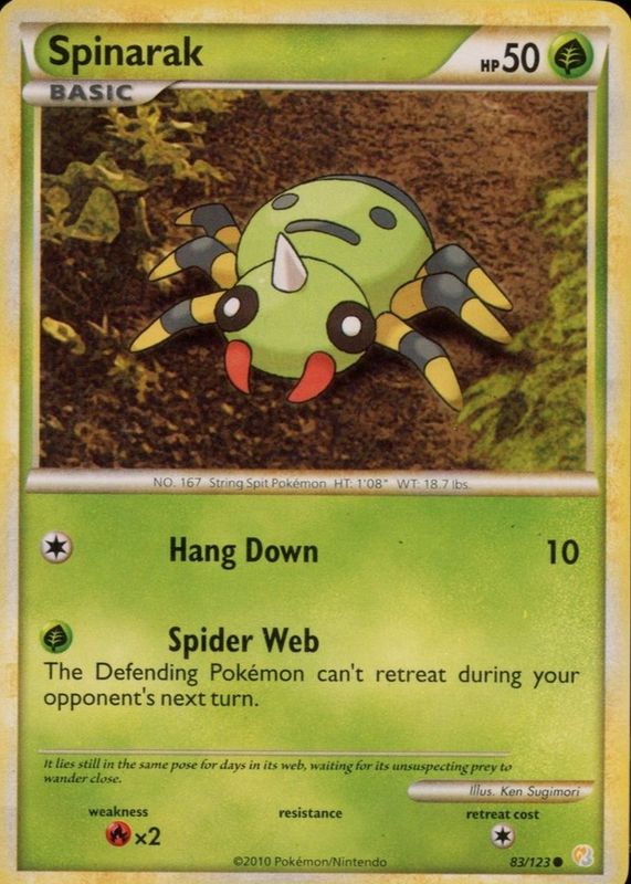 The Spinarak 2010 HeartGold & SoulSilver #083/123 Base card in Raw TCG (Lightly Played) condition has not changed in price in the last 30 days and was last sold for $1.37 .