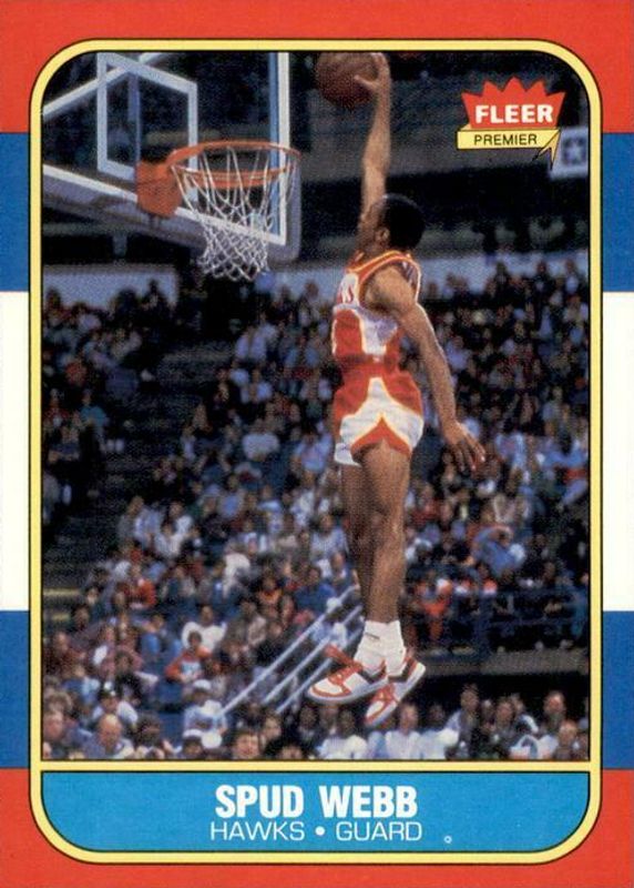 The Spud Webb 1986 Fleer #120 Base Rookie card in Raw condition has moved down -$36.65 (-65.4%) in the last 30 days and was last sold for $19.38 .
