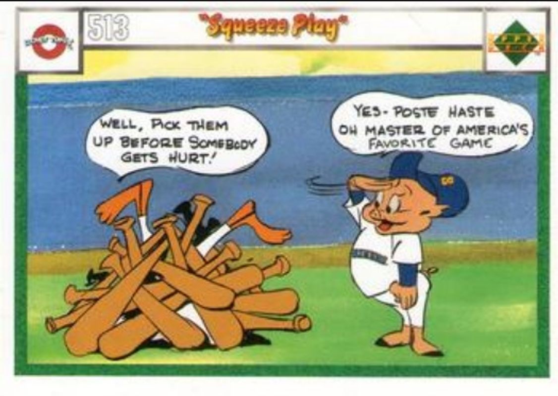 The Squeeze Play 1990 Upper Deck Comic Ball #513-/-516 Base card is 1 of 32 Squeeze Play's card variations in the 1990 Upper Deck Comic Ball set being tracked by Sports Card Investor, including #487-/-502 Base, #488-/-503 Base, #489-/-504 Base, #490-/-499 Base, and #491-/-500 Base.