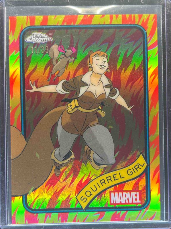 The Squirrel Girl 2025 Topps Chrome #44 Human Torch Refractor /39 card is 1 of 23 Squirrel Girl's card variations in the 2025 Topps Chrome set being tracked by Sports Card Investor, including Base, Refractor, Yellow Lava Refractor, Spider Web Refractor /399, and Blue Refractor /299.