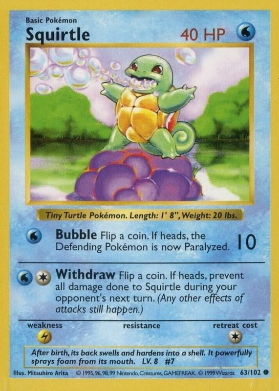 Squirtle 63/102 Base Set Common Regular Shadowless 1999 WOTC Pokemon TCG MP