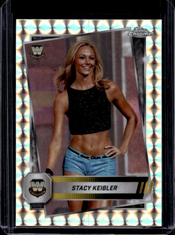 The Stacy Keibler 2025 Topps Chrome WWE #85 Geometric Refractor card is 1 of 50 Stacy Keibler's card variations in the 2025 Topps Chrome WWE set being tracked by Sports Card Investor, including Base, Black & Gold Refractor, Neon Green & Black Refractor, Pink Shimmer Refractor, and Prism Refractor.