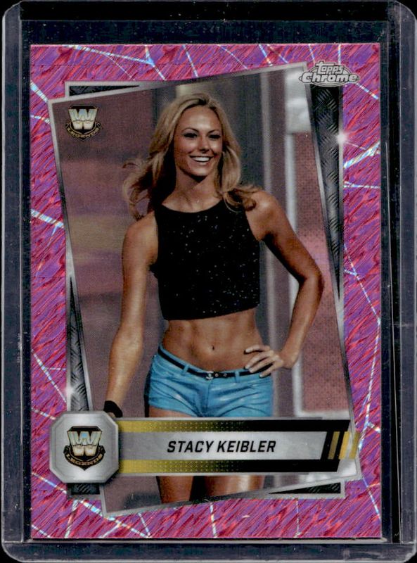 The Stacy Keibler 2025 Topps Chrome WWE #85 Pink Shimmer Refractor card is 1 of 50 Stacy Keibler's card variations in the 2025 Topps Chrome WWE set being tracked by Sports Card Investor, including Base, Black & Gold Refractor, Geometric Refractor, Neon Green & Black Refractor, and Prism Refractor.