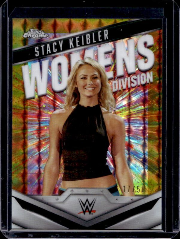 The Stacy Keibler 2025 Topps Chrome WWE #WD-STA Women's Division - Gold Geometric Refractor /50 card is 1 of 50 Stacy Keibler's card variations in the 2025 Topps Chrome WWE set being tracked by Sports Card Investor, including Base, Black & Gold Refractor, Geometric Refractor, Neon Green & Black Refractor, and Pink Shimmer Refractor.