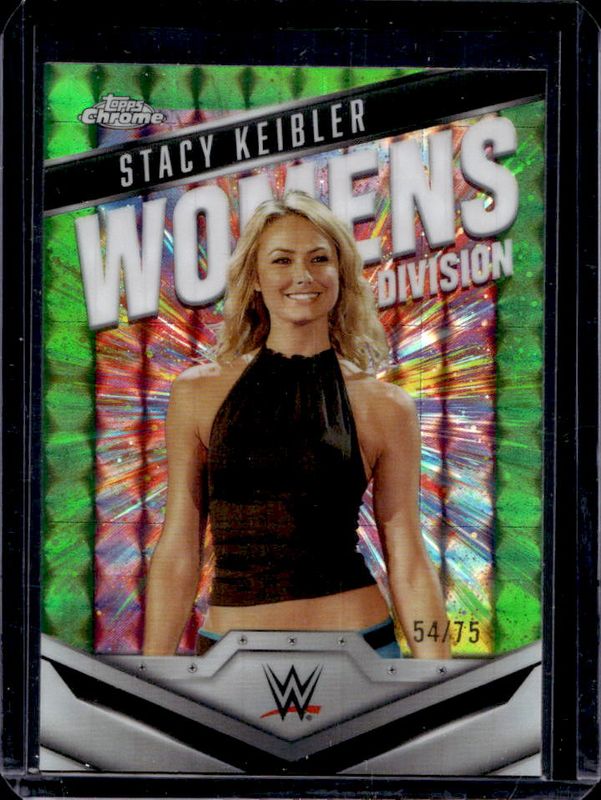 The Stacy Keibler 2025 Topps Chrome WWE #WD-STA Women's Division - Neon Green Geometric Refractor /75 card is 1 of 50 Stacy Keibler's card variations in the 2025 Topps Chrome WWE set being tracked by Sports Card Investor, including Base, Black & Gold Refractor, Geometric Refractor, Neon Green & Black Refractor, and Pink Shimmer Refractor.