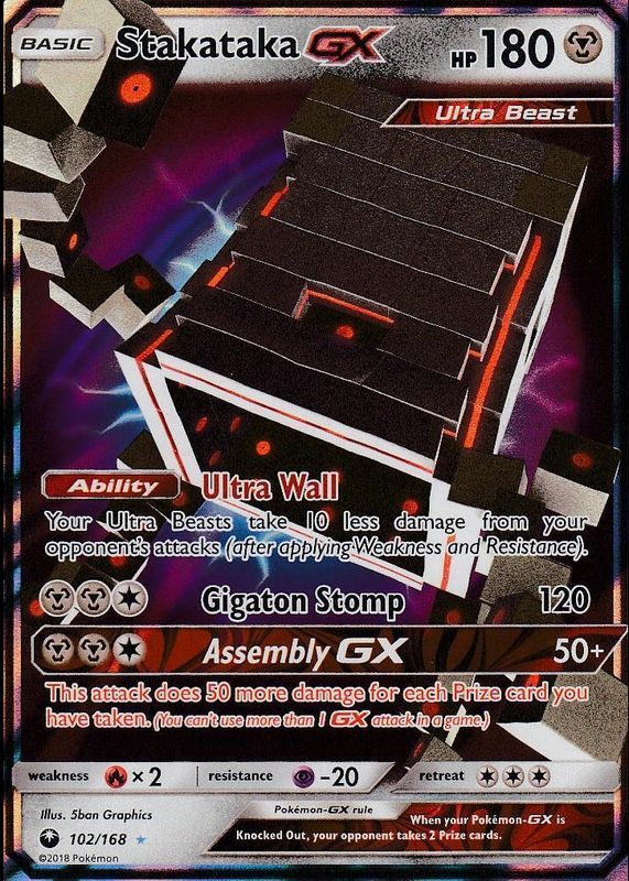 The Stakataka GX 2018 Sun & Moon: Celestial Storm #102/168 Holo card in Raw TCG (Near Mint) condition has moved up $0.21 (+3.5%) in the last 30 days and was last sold for $5.99 .