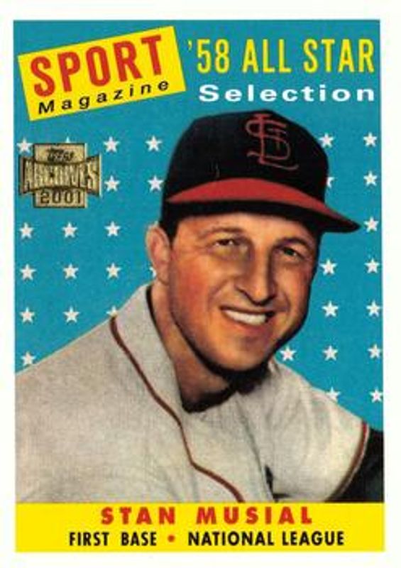The Stan Musial 2001 Topps Archives #31 Base card is 1 of 6 Stan Musial's card variations in the 2001 Topps Archives set being tracked by Sports Card Investor, including #180 Base, #215 Base, #217 Base, #220 Base, and #TAA59 Autographs.