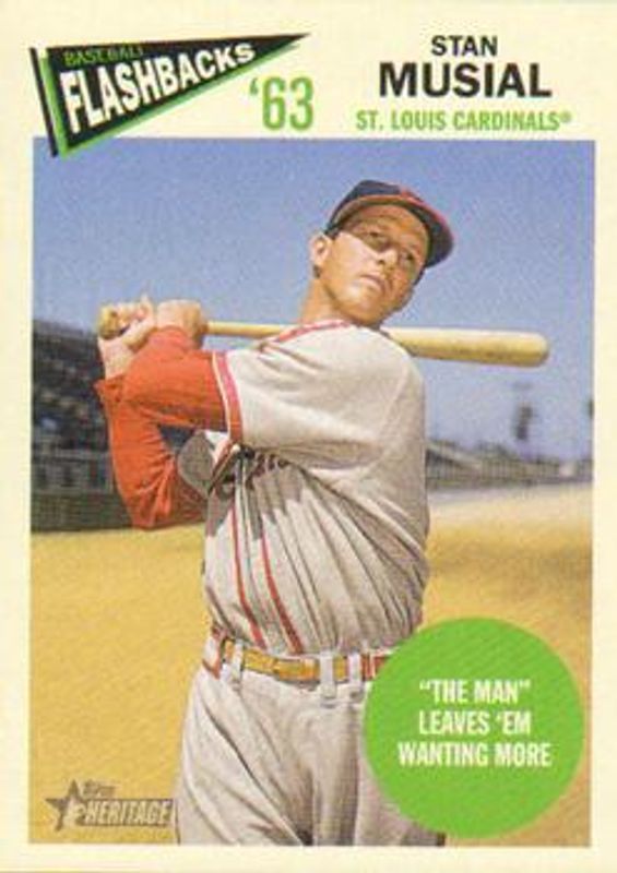 The Stan Musial 2012 Topps Heritage #BF-SM Baseball Flashbacks card is 1 of 8 Stan Musial's card variations in the 2012 Topps Heritage set being tracked by Sports Card Investor, including Player Samples, 50th Anniversary Buybacks, 63 Mint, Flashback Stadium Relics, and Real One Autographs.