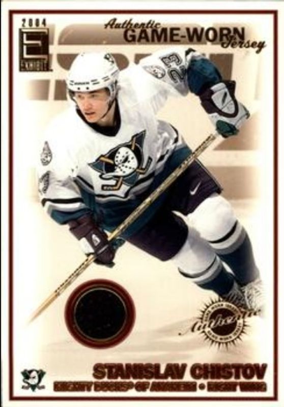 The Stanislav Chistov 2003 Pacific Exhibit #201 Base /955 card is 1 of 5 Stanislav Chistov's card variations in the 2003 Pacific Exhibit set being tracked by Sports Card Investor, including Base /955, Yellow Backs, Silver /465, and Blue Backs /275.