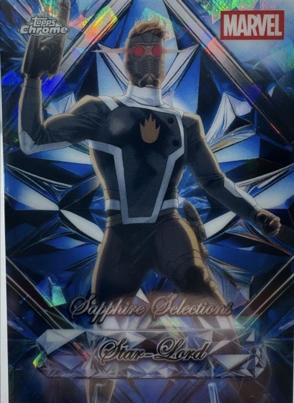 The Star-Lord 2025 Topps Chrome Sapphire Edition #SS-7 Sapphire Selections card is 1 of 16 Star-Lord's card variations in the 2025 Topps Chrome Sapphire Edition set being tracked by Sports Card Investor, including Base, Green Refractor /99, Aqua Refractor /75, Gold Refractor /50, and Orange Refractor /25.