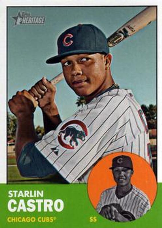 The Starlin Castro 2012 Topps Heritage #193a Base card is 1 of 14 Starlin Castro's card variations in the 2012 Topps Heritage set being tracked by Sports Card Investor, including Base, Black, Player Samples, Target Red Border, and Chrome /1963.