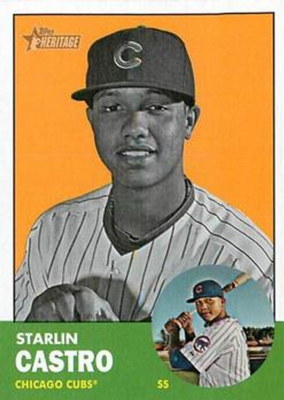 The Starlin Castro 2012 Topps Heritage #193b Base card is 1 of 14 Starlin Castro's card variations in the 2012 Topps Heritage set being tracked by Sports Card Investor, including Base, Black, Player Samples, Target Red Border, and Chrome /1963.