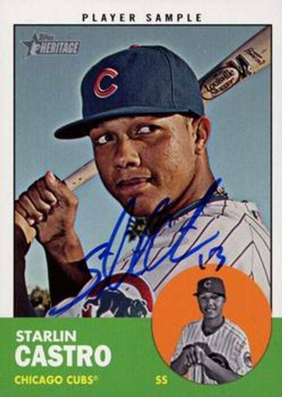 The Starlin Castro 2012 Topps Heritage #ROA-SC Player Samples card is 1 of 14 Starlin Castro's card variations in the 2012 Topps Heritage set being tracked by Sports Card Investor, including #193a Base, #193b Base, #HP80 Black, #193 Target Red Border, and #HP80 Chrome /1963.