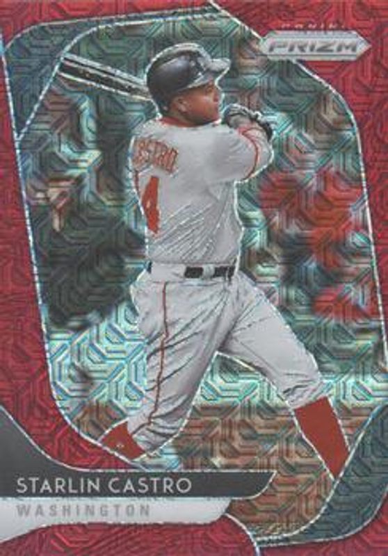 The Starlin Castro 2020 Prizm #144 Red Mojo /149 card is 1 of 36 Starlin Castro's card variations in the 2020 Prizm set being tracked by Sports Card Investor, including Base, Blue, Carolina Blue, Cosmic Haze, and Green.
