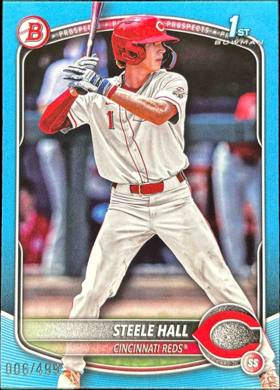 The Steele Hall 2025 Bowman Draft #BD-20 Sky Blue Border /499 card is 1 of 135 Steele Hall's card variations in the 2025 Bowman Draft set being tracked by Sports Card Investor, including Base, Chrome (1st), Chrome - Lazer Refractor (1st), Chrome - Refractor (1st), and Chrome - Sky Blue Refractor (1st).