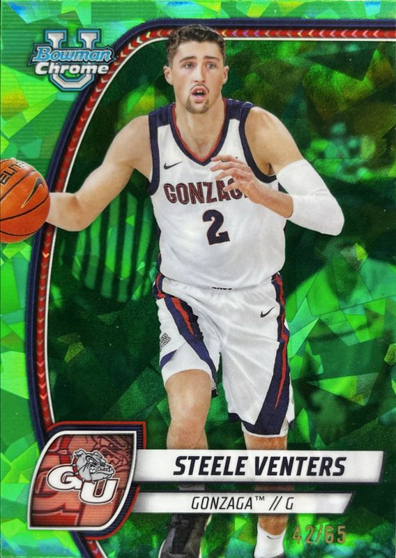The Steele Venters 2024 Bowman Chrome University Sapphire Edition #92 Green Refractor /65 card is 1 of 18 Steele Venters' card variations in the 2024 Bowman Chrome University Sapphire Edition set being tracked by Sports Card Investor, including Base, Purple Refractor /100, Yellow Refractor /75, Gold Refractor /50, and Orange Refractor /25.