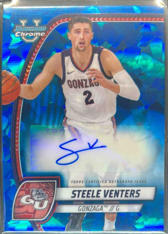 The Steele Venters 2024 Bowman Chrome University Sapphire Edition #92 Prospect Autographs card is 1 of 18 Steele Venters' card variations in the 2024 Bowman Chrome University Sapphire Edition set being tracked by Sports Card Investor, including Base, Purple Refractor /100, Yellow Refractor /75, Green Refractor /65, and Gold Refractor /50.
