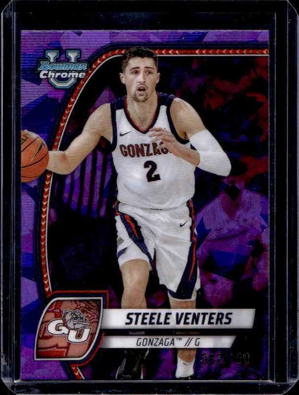 The Steele Venters 2024 Bowman Chrome University Sapphire Edition #92 Purple Refractor /100 card is 1 of 18 Steele Venters' card variations in the 2024 Bowman Chrome University Sapphire Edition set being tracked by Sports Card Investor, including Base, Yellow Refractor /75, Green Refractor /65, Gold Refractor /50, and Orange Refractor /25.