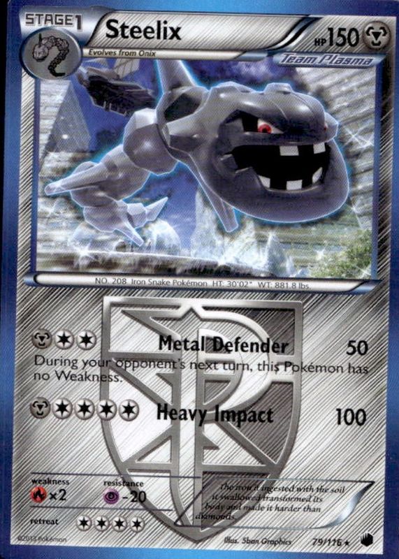 The Steelix 2013 Black & White: Plasma Freeze #079/116 Base card in Raw TCG (Near Mint) condition has moved up $1.51 (+153%) in the last 30 days and was last sold for $2.50 .