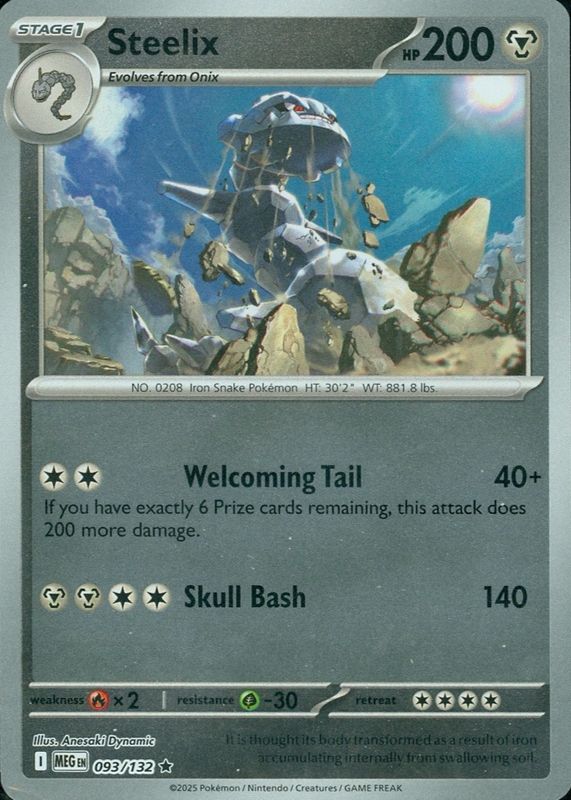 The Steelix 2025 Mega Evolution #093/132 Reverse Holo card in Raw TCG (Lightly Played) condition has not changed in price in the last 30 days and was last sold for $2.19 .