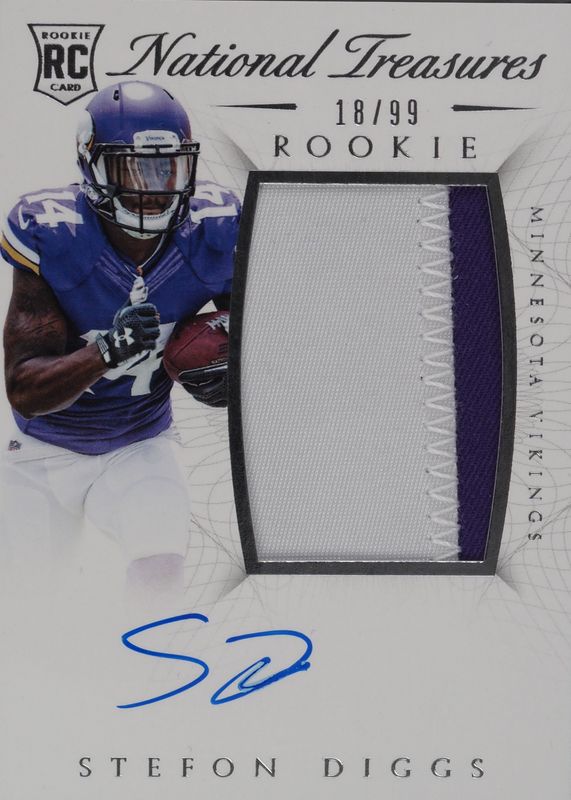 This card is 1 of 9 Stefon Diggs' card variations in the 2015 National Treasures set being tracked by Sports Card Investor, including Rookie Patch Auto - Numbers Green (/14), Rookie Patch Auto - Silver /25, Rookie Patch Auto - Gold /10, Rookie Patch Auto - Black /5, and Rookie Patch Auto - Red Laundry Tag /3.