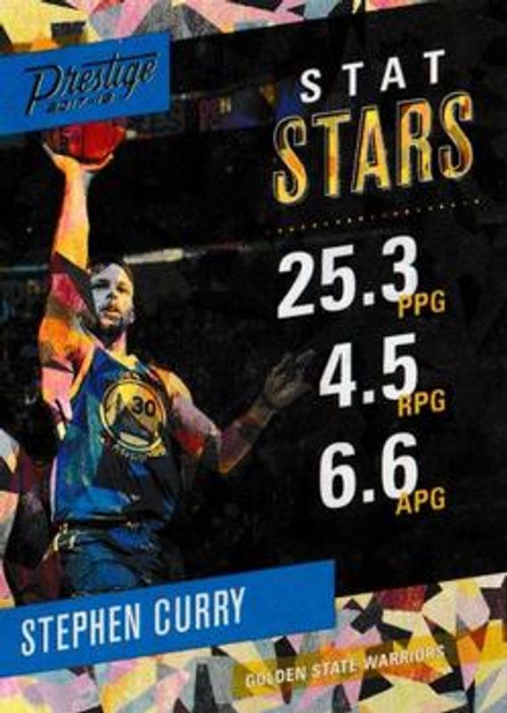 The Stephen Curry 2017 Prestige #9 Stat Stars - Crystal card is 1 of 22 Stephen Curry's card variations in the 2017 Prestige set being tracked by Sports Card Investor, including Base, Playmakers, Stars of the NBA, Stars of the NBA - Crystal, and Stars of the NBA - Horizon.