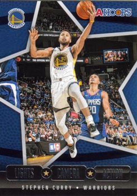 The Stephen Curry 2020 Hoops #26 Lights Camera Action card is 1 of 72 Stephen Curry's card variations in the 2020 Hoops set being tracked by Sports Card Investor, including #252 Base, #130 Base, #130 Blue, #130 Hyper Blue, and #130 Neon Green.