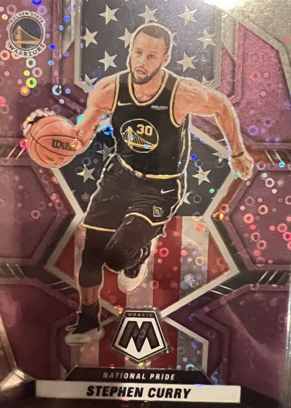 The Stephen Curry 2021 Mosaic #247 National Pride - Fast Break Purple /50 card in Raw condition has not changed in price in the last 30 days and was last sold for $115.24 .