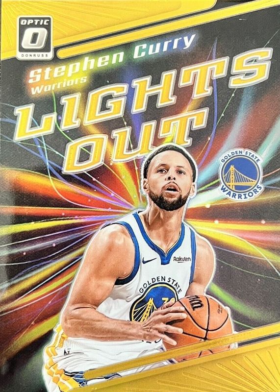 The Stephen Curry 2023 Optic #6 Lights Out - Gold /10 card in Raw condition has not changed in price in the last 30 days and was last sold for $193.50 .