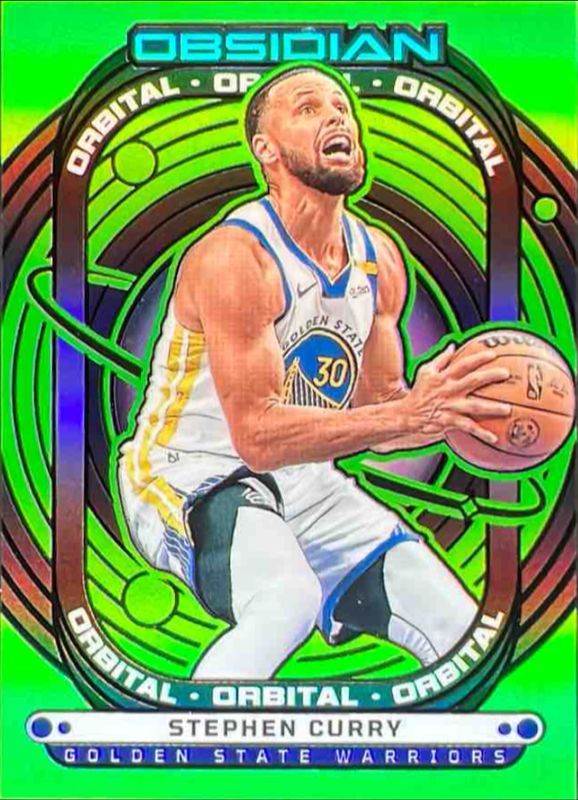 The Stephen Curry 2024 Obsidian #9 Orbital - Electric Etch Jade /25 card is 1 of 144 Stephen Curry's card variations in the 2024 Obsidian set being tracked by Sports Card Investor, including #182 Base, #95 Base, #95 Electric Etch Caldera, #182 Electric Etch Caldera, and #182 Electric Etch International.