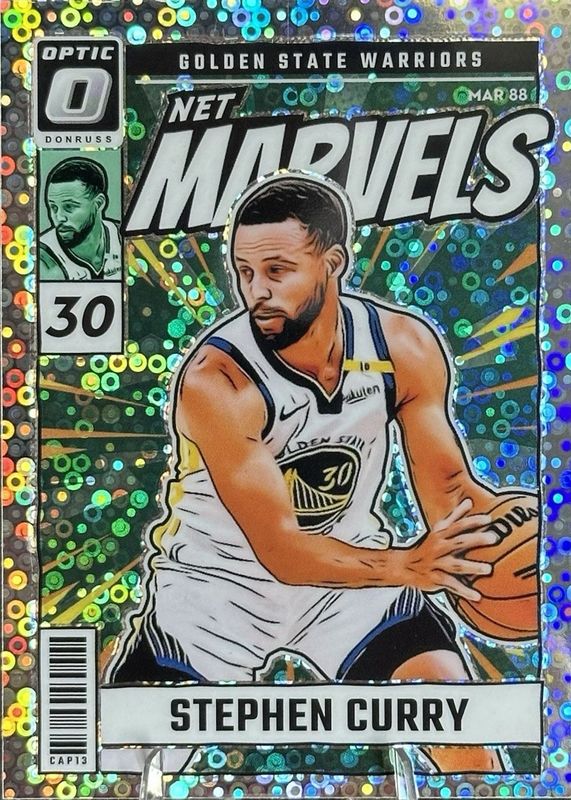 The Stephen Curry 2024 Optic #15 Net Marvels - Fast Break card in Raw condition has moved down -$1.00 (-2.0%) in the last 30 days and was last sold for $48.99 .