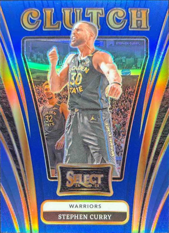 The Stephen Curry 2024 Select #11 Clutch Blue /75 card is 1 of 313 Stephen Curry's card variations in the 2024 Select set being tracked by Sports Card Investor, including Concourse, Courtside, Mezzanine, Premier Level, and Concourse Blue Cracked Ice.