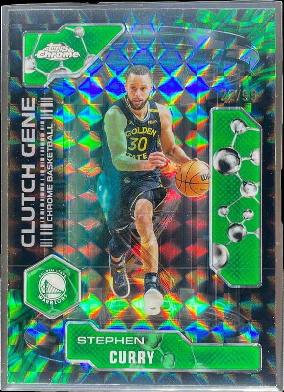 The Stephen Curry 2025 Topps Chrome #CG-2 Clutch Gene - Green Geometric Refractor /99 card is 1 of 270 Stephen Curry's card variations in the 2025 Topps Chrome set being tracked by Sports Card Investor, including Base, 1st Day Issue Refractor, Basketball Refractor, Box Set Refractor, and Image Variation.