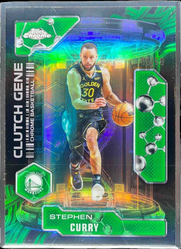 The Stephen Curry 2025 Topps Chrome #CG-2 Clutch Gene - Green Refractor /99 card is 1 of 270 Stephen Curry's card variations in the 2025 Topps Chrome set being tracked by Sports Card Investor, including Base, 1st Day Issue Refractor, Basketball Refractor, Box Set Refractor, and Image Variation.