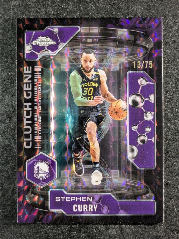 The Stephen Curry 2025 Topps Chrome #CG-2 Clutch Gene - Purple Refractor /75 card is 1 of 270 Stephen Curry's card variations in the 2025 Topps Chrome set being tracked by Sports Card Investor, including Base, 1st Day Issue Refractor, Basketball Refractor, Box Set Refractor, and Image Variation.