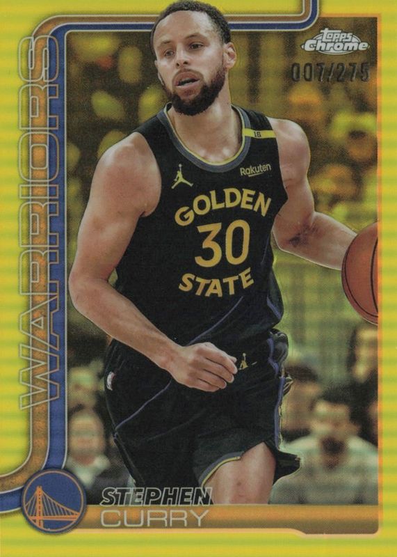 The Stephen Curry 2025 Topps Chrome #201 Yellow Refractor /275 card in Raw condition has moved up $25.05 (+26.4%) in the last 30 days and was last sold for $120.00 .