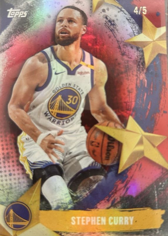 The Stephen Curry 2025 Topps #SA-5 Stars of the NBA - Red Rainbow /5 card in Raw condition has not changed in price in the last 30 days and was last sold for $1,299.00 .