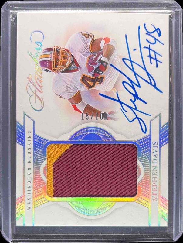 The Stephen Davis 2025 Flawless #68 Patch Autographs - Silver /20 card is 1 of 16 Stephen Davis' card variations in the 2025 Flawless set being tracked by Sports Card Investor, including Patch Autographs /25, Star Swatch Signatures /25, Star Swatch Signatures - Silver /20, Patch Autographs - Ruby /15, and Star Swatch Signatures - Ruby /15.
