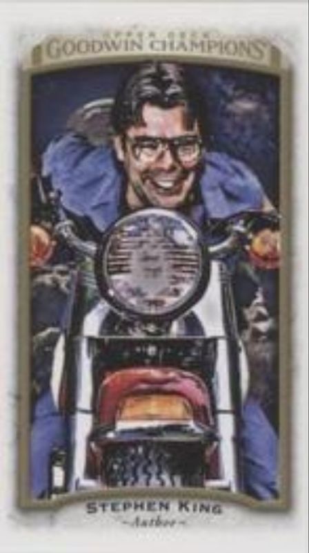 The Stephen King 2017 Upper Deck Goodwin Champions #100 Minis card is 1 of 56 Stephen King's card variations in the 2017 Upper Deck Goodwin Champions set being tracked by Sports Card Investor, including #150 Base, #50 Base, #50b Base, #100 Base, and Blank Back Mini.