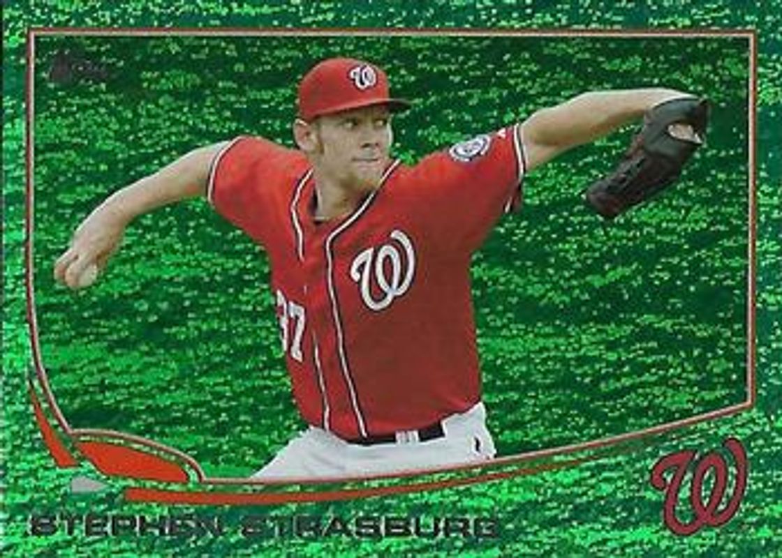 The Stephen Strasburg 2013 Topps #500 Emerald Foil card is 1 of 34 Stephen Strasburg's card variations in the 2013 Topps set being tracked by Sports Card Investor, including 1972 Topps Minis, Base, Chasing History, Chasing History - Gold Foil, and Chasing History Relics.