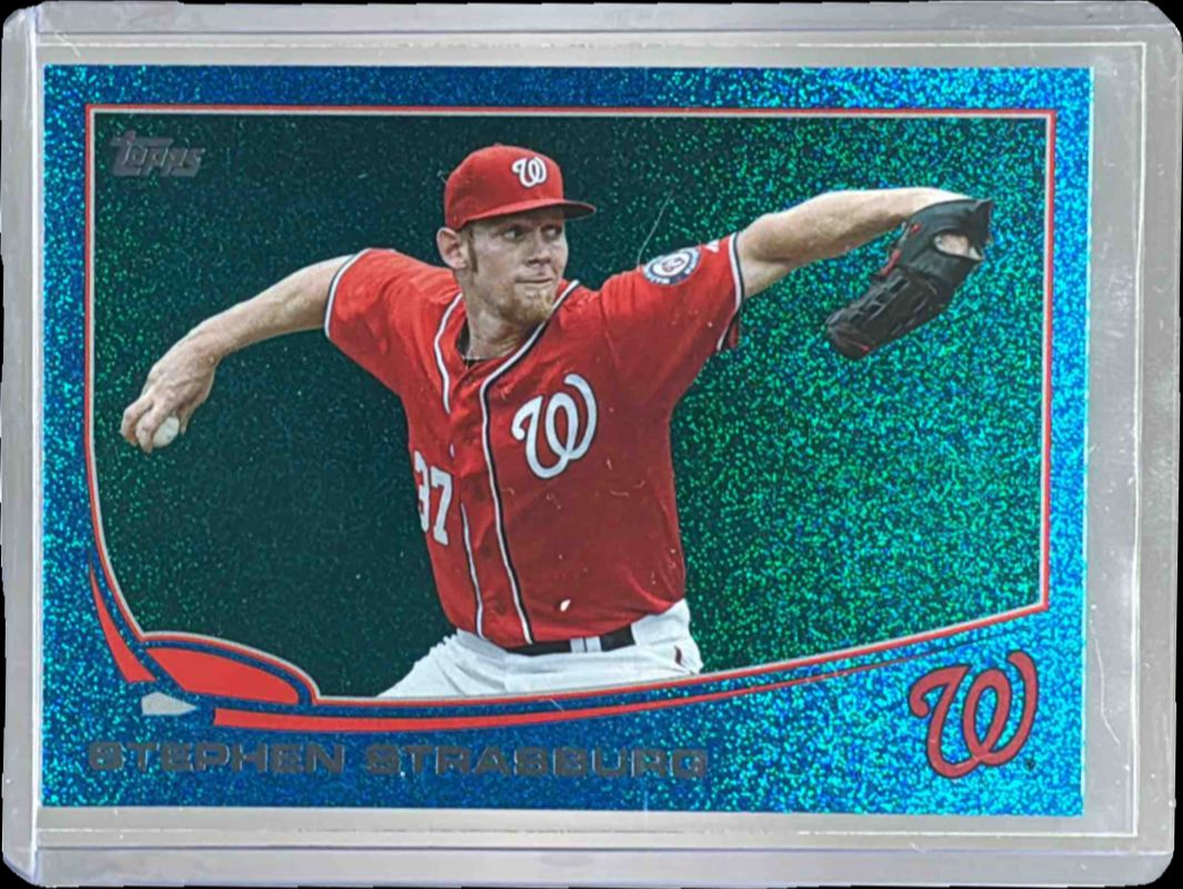 The Stephen Strasburg 2013 Topps #500 Silver Slate Blue Sparkle card is 1 of 34 Stephen Strasburg's card variations in the 2013 Topps set being tracked by Sports Card Investor, including 1972 Topps Minis, Base, Chasing History, Chasing History - Gold Foil, and Chasing History Relics.